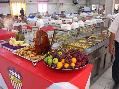 Junto algumas imagens de um refeitório do exército americano, algures no Iraque, onde, podem observar as "semelhanças" (aldra) com as nossas messes, cantinas e refeitórios da Guiné. Vejam lá estas comidinhas ao pé das nossas "magnificas" rações de combate. Aqui só faltam umas bacalhausadas, umas feijoadas à transmontana, um cozidinho à portuguesa, etc. Com esta apresentação não haveriam levantamentos de rancho, seria um descanso para o capitão e o vagomestre seria pessoa benquista!